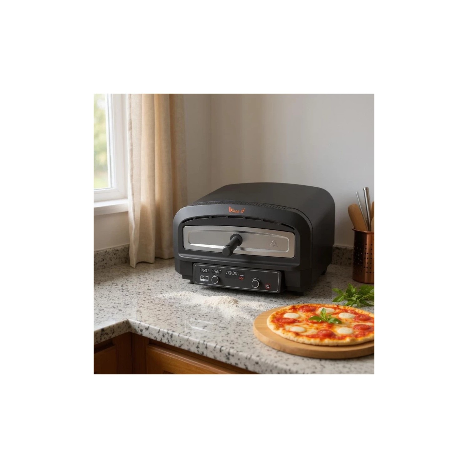 Con una potenza di 2200 W e una temperatura massima di 450 °C, cuoce pizze fino a 37 cm di diametro in soli 2 minuti. Dotato di funzioni avanzate come memoria per temperatura e timer, display multifunzione e accessori rimovibili per una pulizia pratica. Inclusa una pala per pizza per infornare e sfornare in tutta sicurezza.