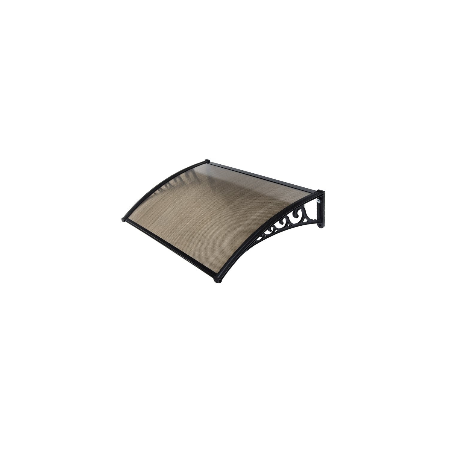 Pensilina con braccetti in polipropilene rinforzato, profili in alluminio sia sulla parte frontale che sul retro. La copertura in policarbonato alveolare ha un aspetto rigato.