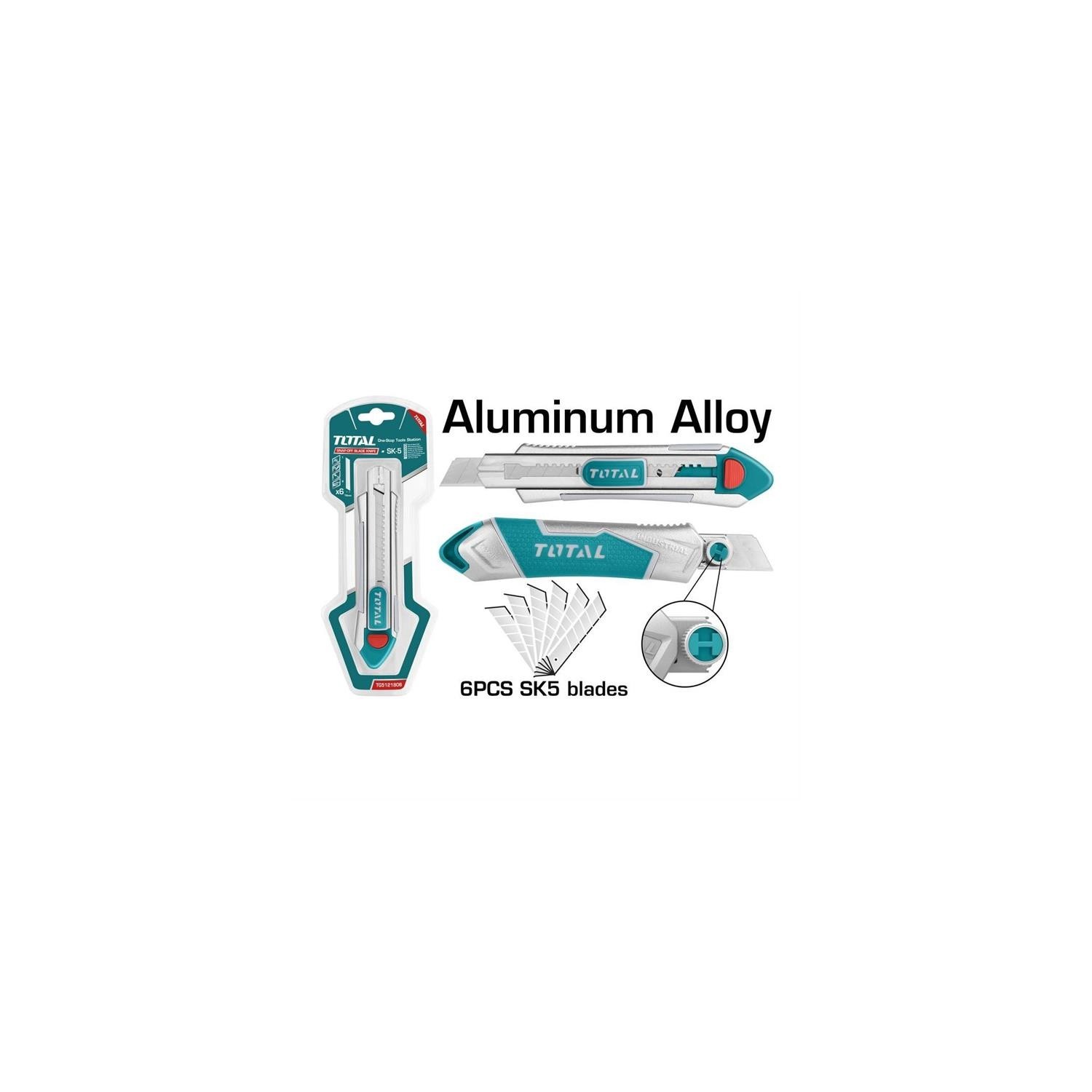 DESCRIZIONE DEL PRODOTTO Lame: 18mm*100mm Lunghezza: 185mm Incluse 6 lame SK5 (TOTTHT519181) Struttura in Alluminio