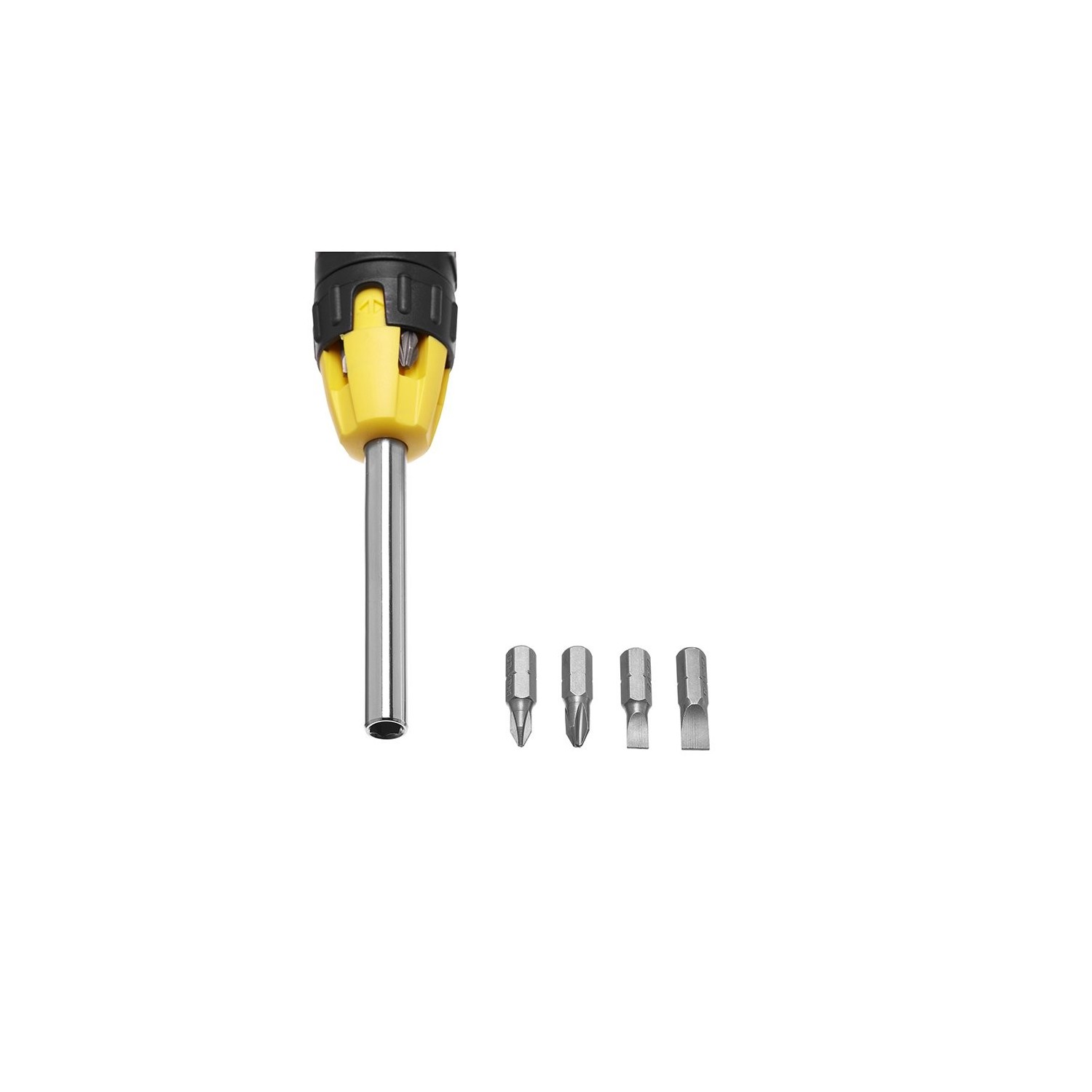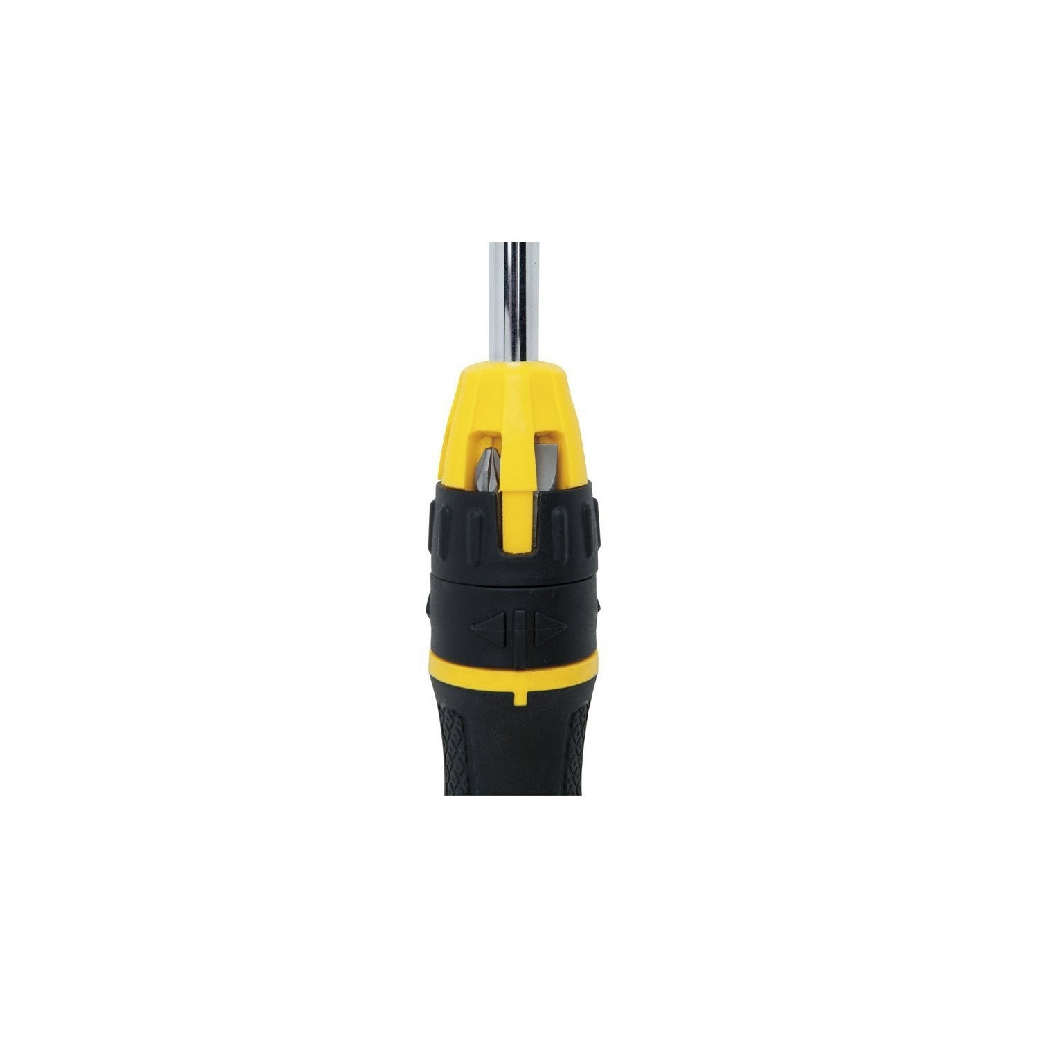 Nuovo design. Meccanismo di movimento del cricchetto in senso orario e antiorario + posizione di bloccaggio. Impugnatura tri-lobare in bi-componente per maggior comfort d'uso e controllo della presa. Sistema brevettato di alloggiamento degli inserti, che contiene 6 punte. Ulteriore alloggiamento di altre 6 punte nell'impugnatura. Fornito con 10 punte (Ph. 1-2, Pozi 1-2, Std 5-6,5, Torx T10-T15, quadra 1-2).