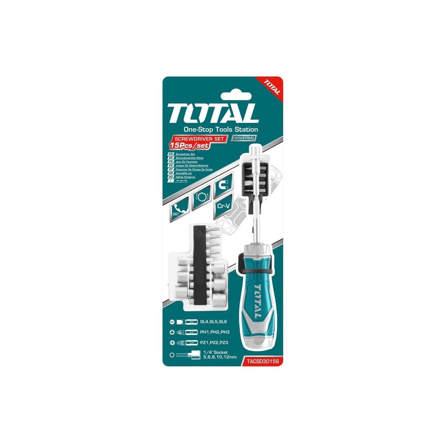 Cacciavite con 14 punte e accessori Include: 1 impugnatura Industrial - 36T 9 punte avvitatore 6.3*25mm - Misura: SL4, SL5, SL6, PH1, PH2, PH3, PZ1, PZ2, PZ3 5 brugole da 1/4": 5, 6, 8, 10, 12mm Materiale: CR-V