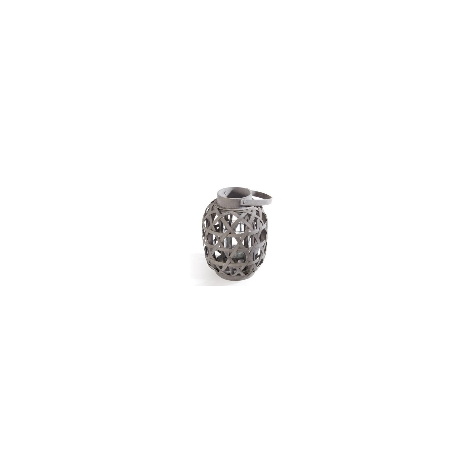 Lanterna in legno intrecciato. Vasetto interno porta candela in vetro. Colore: grigio. Dimensioni: Ø 12.5/23 – H. 30 cm.