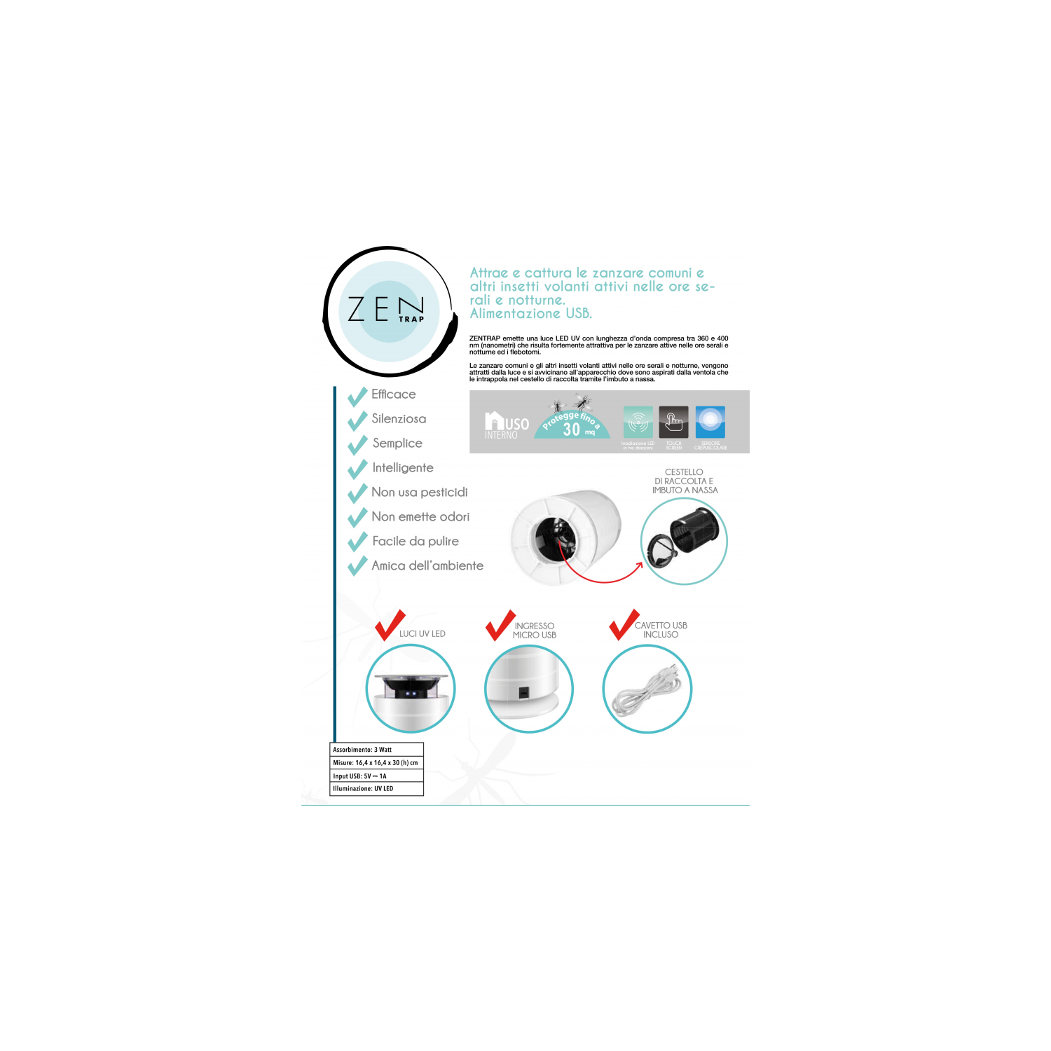 Efficace, silenziosa, semplice, intelligente, non usa pesticidi, non emette odori, facile da pulire, amica dell'ambiente, cavetto USB incluso.