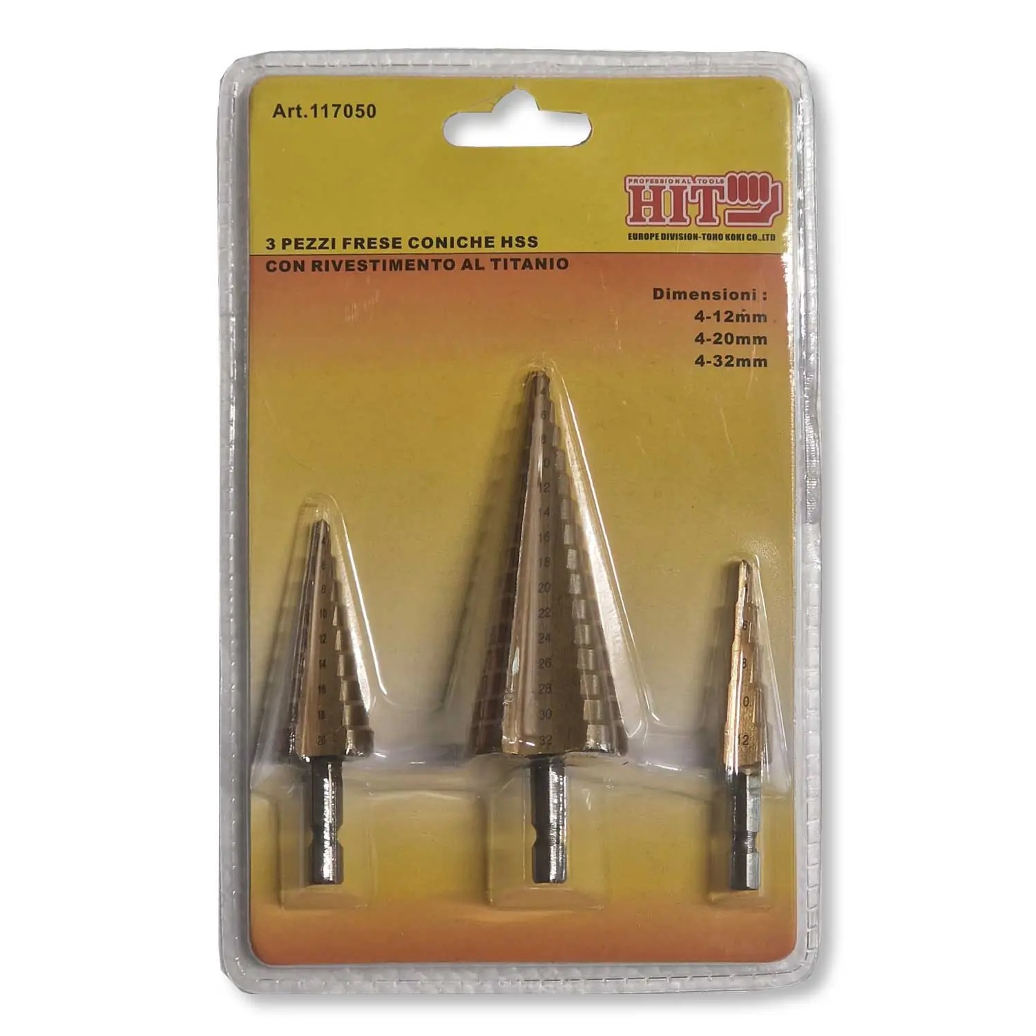 Set professionale composto da tre utensili con rivestimento al titanio, progettati per garantire elevate prestazioni, lunga durata e precisione durante le lavorazioni.