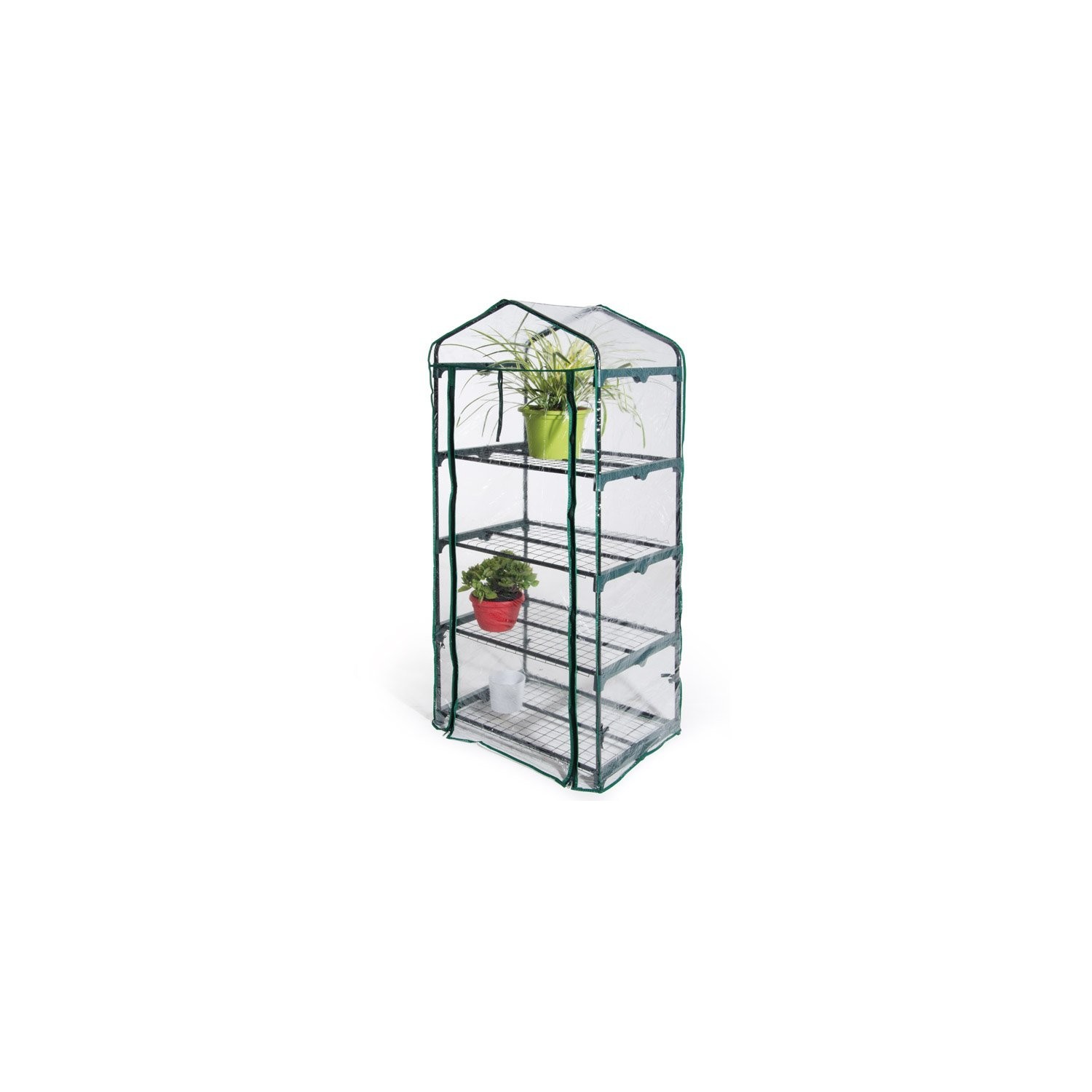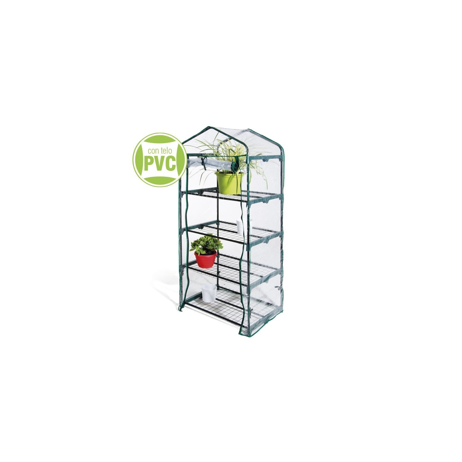 Serra a quattro ripiani con struttura in metallo verniciato e parti di raccordo in materiale plastico.