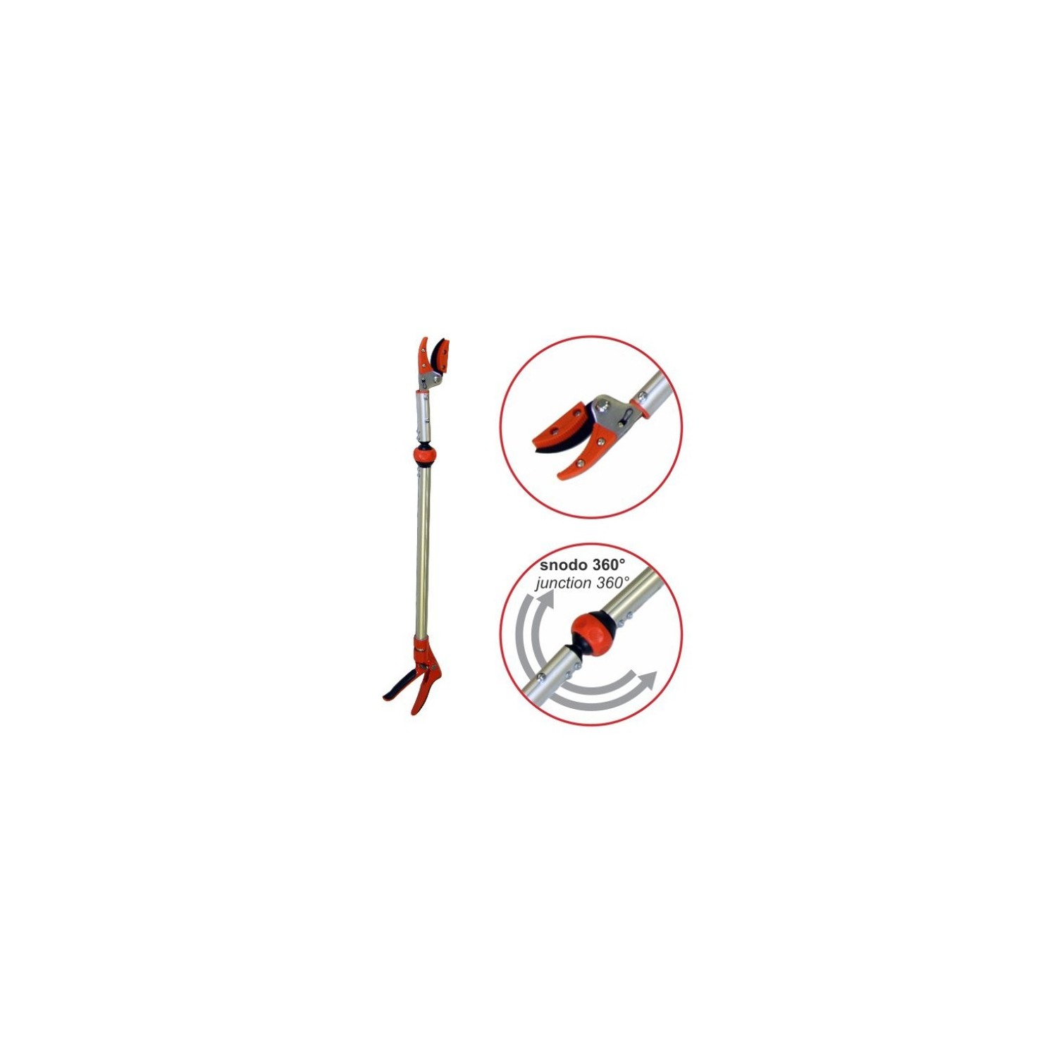 Cesoia coglifrutta ad asta snodabile in alluminio. Snodo a 360°. Impugnatura ruotabile fino a 180°.