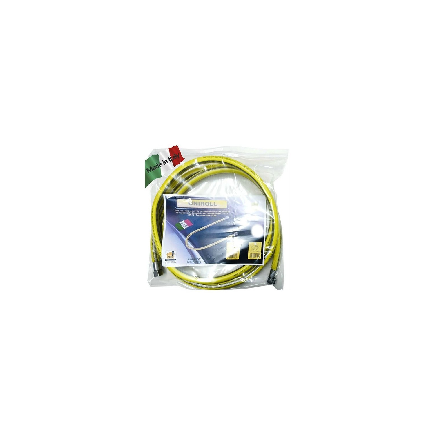 Tubo uniroll CSST acciaio inox 316 L rivestito giallo per gas UNI EN 15266 max 0.5bar, atto al collegamente del piano cottura alla rete domestica del gas.