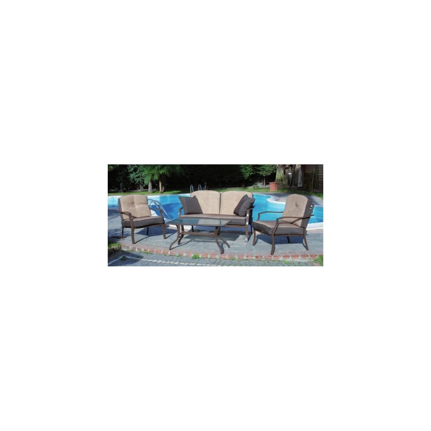 Questo set completo di tavolo più divano e 2 poltrone è comodissimo per sfruttare gli spazi all’esterno.completo di cuscini