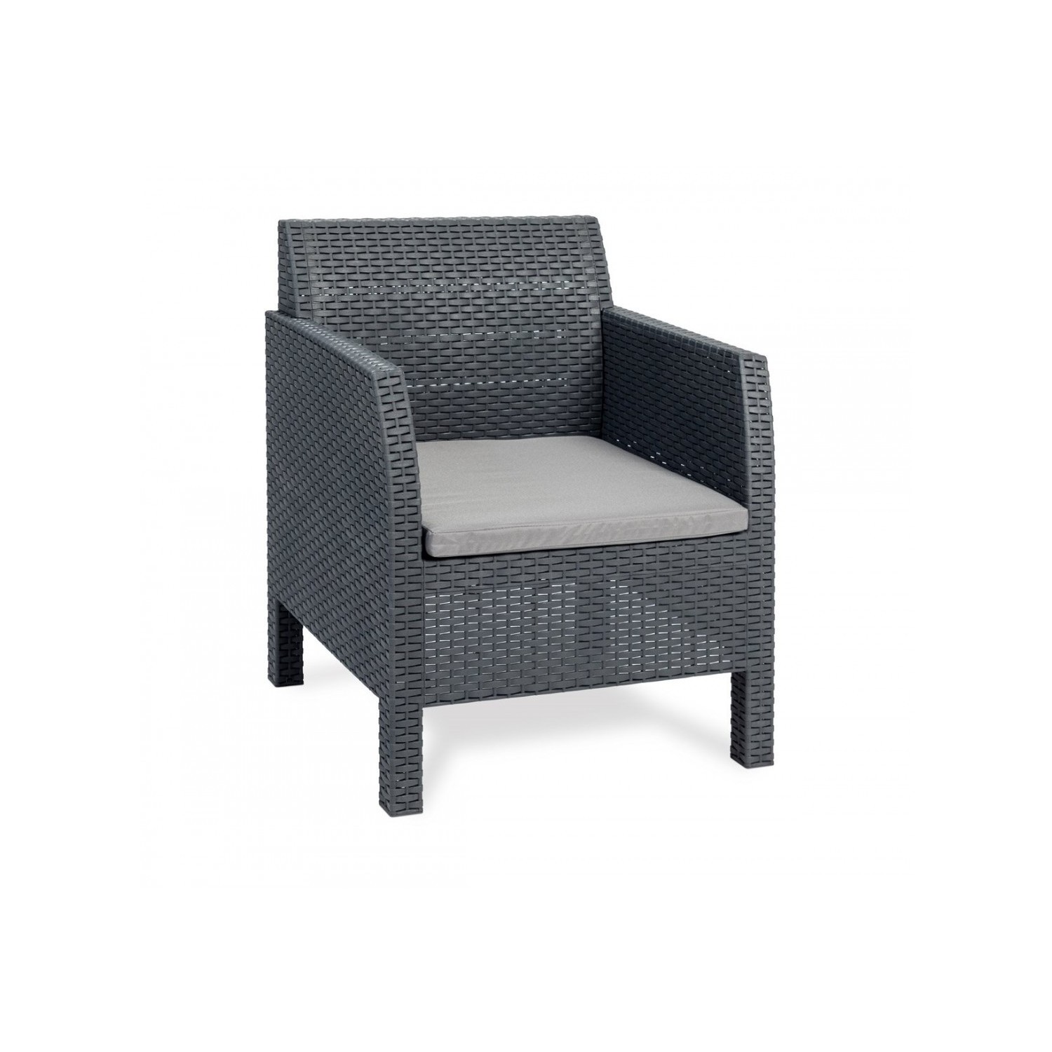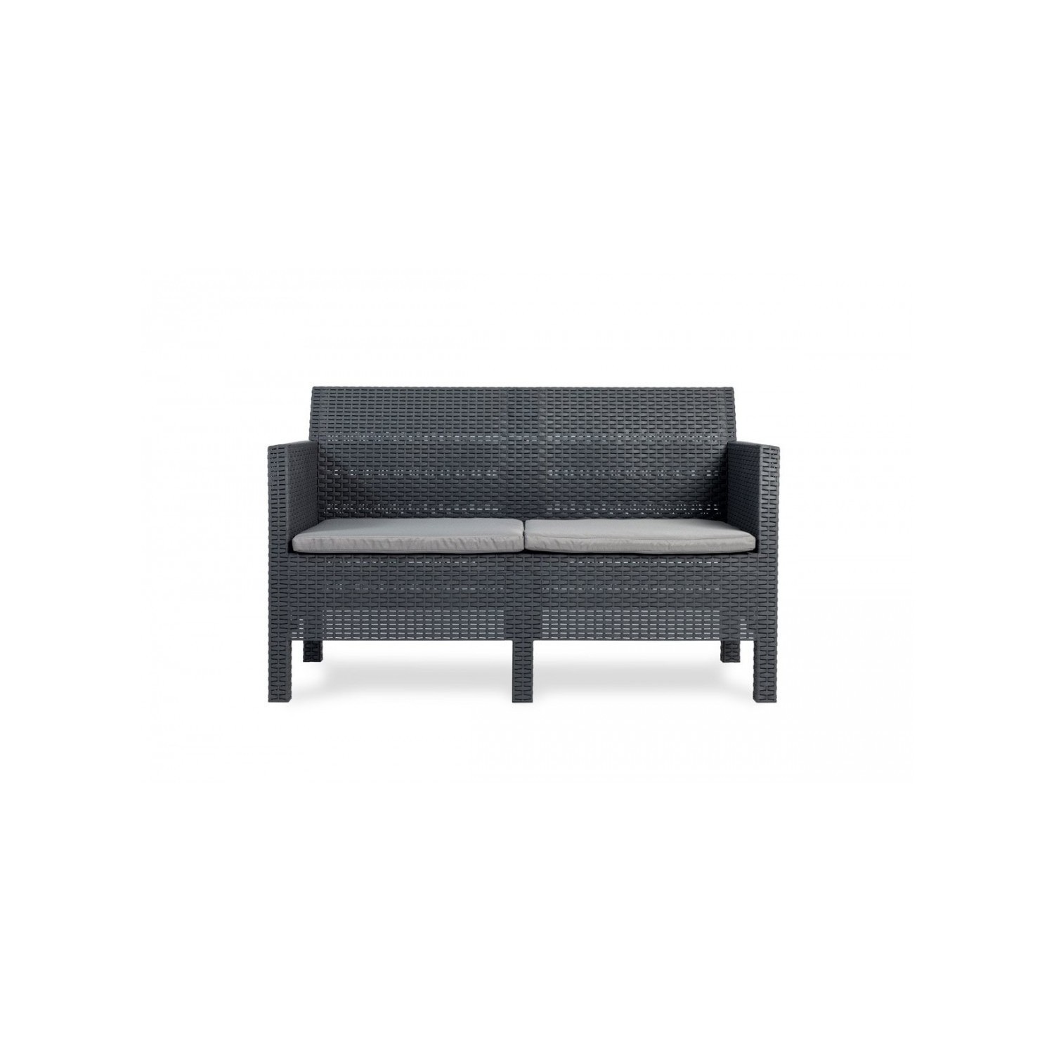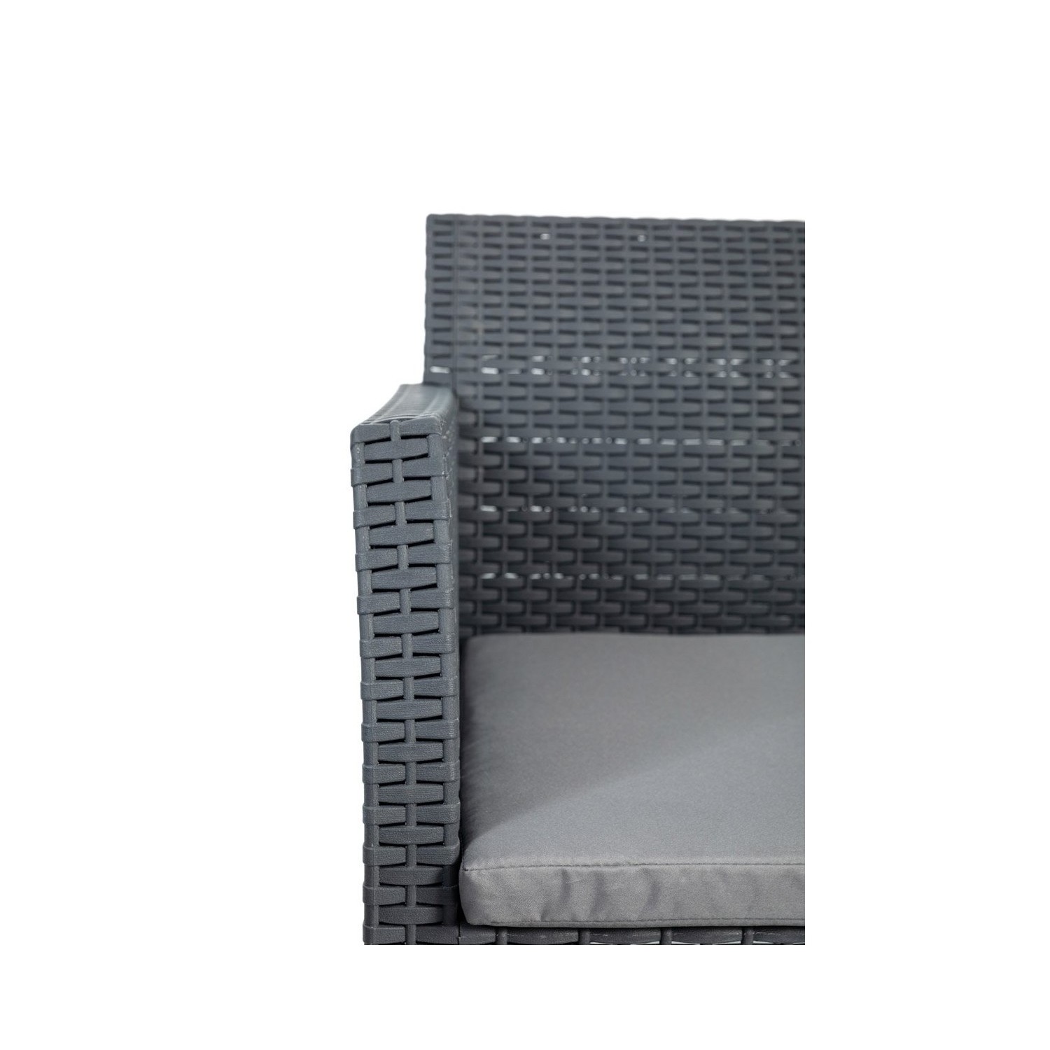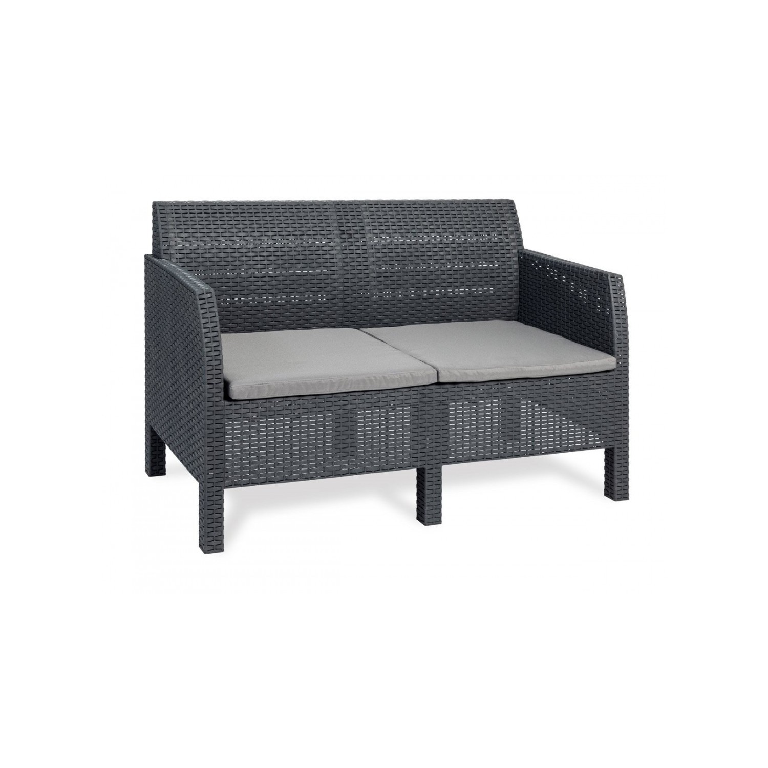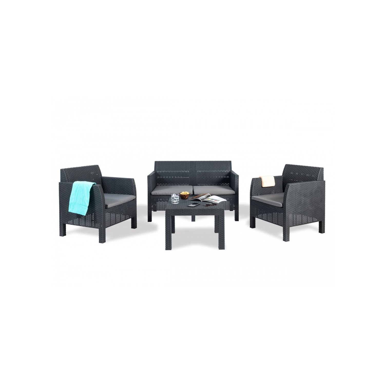 Set di 2 poltrone con cuscini, 1 divano con 2 sedute con cuscini e 1 tavolo da giardino