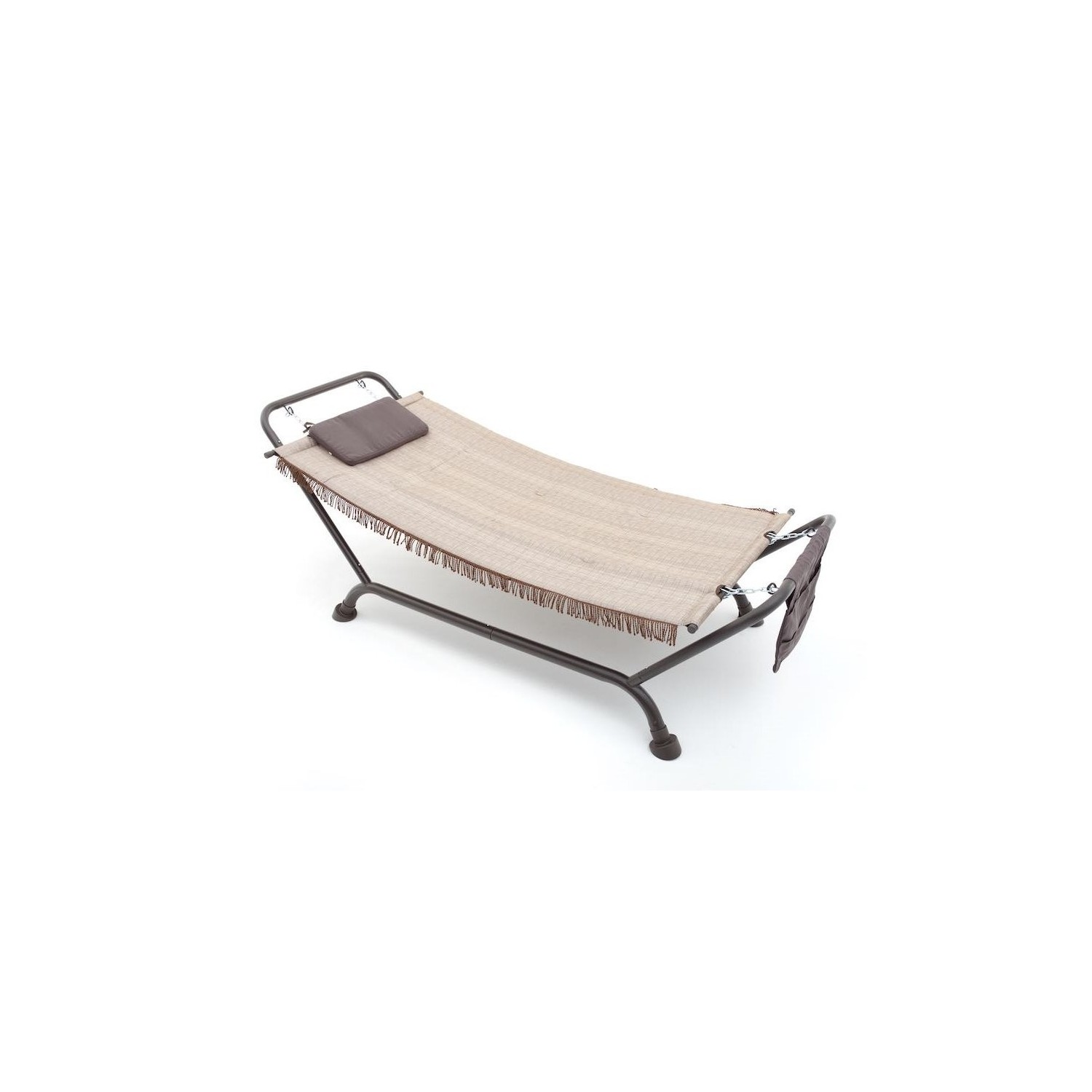 STRUTTURA IN TUBOLARE DI FERRO VERNICIATO A POLVERE EPOSSIDICA DI COLORE MARRONE, TELO IMBOTTITO IN POLIESTERE DI COLORE BEIGE, CUSCINO POGGIATESTA E SACCA PORTARIVISTA.
