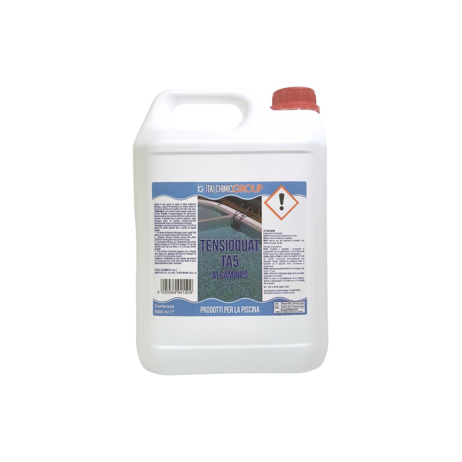 Antialghe Tensioquat TA5- Algaminus di Italchimici Group, l'innovativo prodotto a bassa concentrazione ideale per mantenere la tua piscina sempre limpida e igienizzata. Grazie alla sua potente azione igienizzante, derivante dalla presenza di ammina e un particolare tipo di ammonio quaternario, questo antialghe previene efficacemente l'intorbidimento e la ricontaminazione dell'acqua.
