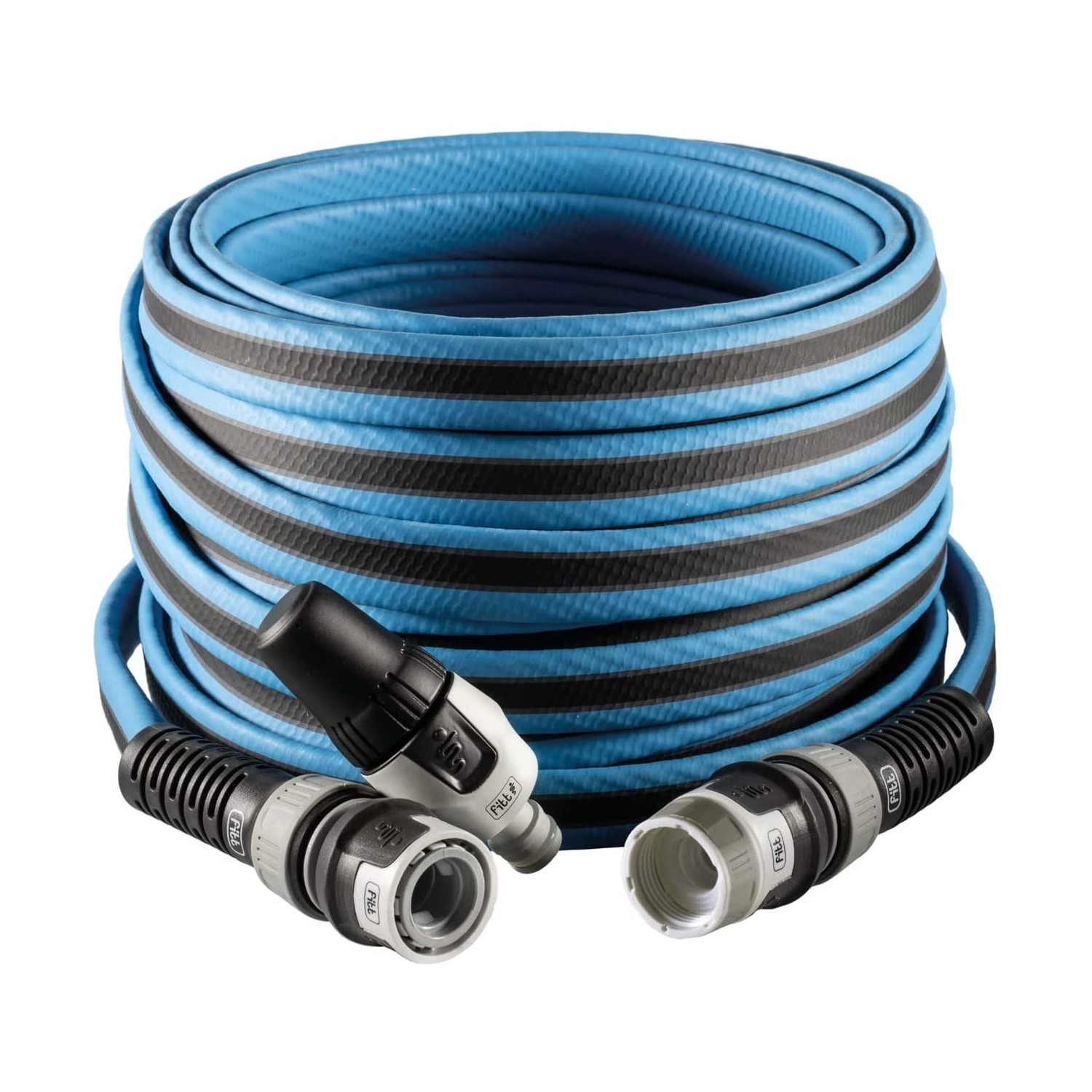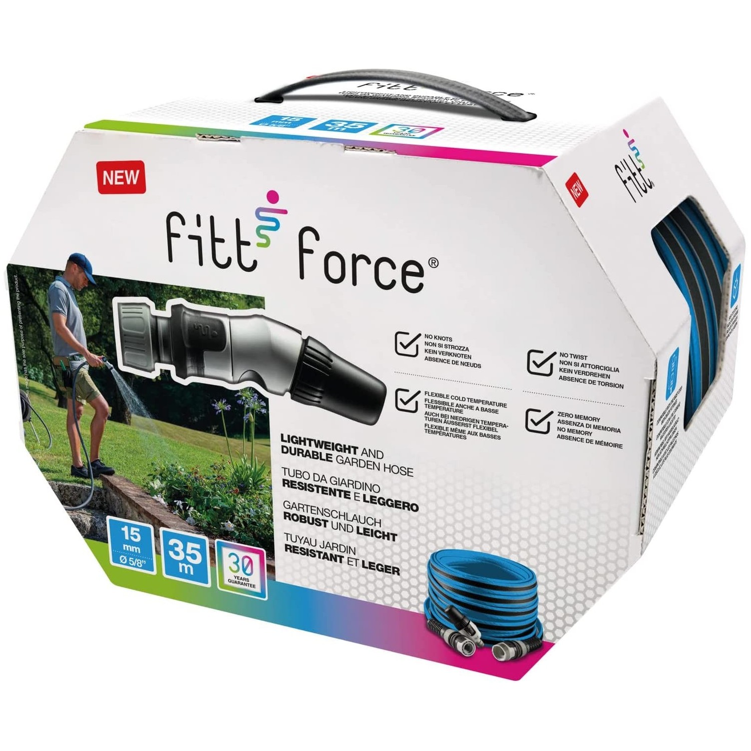 FITT FORCE 5/8" 35m, Tubo Acqua da Giardino per Irrigazione, Compatto, Leggero e Resistente per Uso Intensivo con Lancia, Blu con riga Grigia