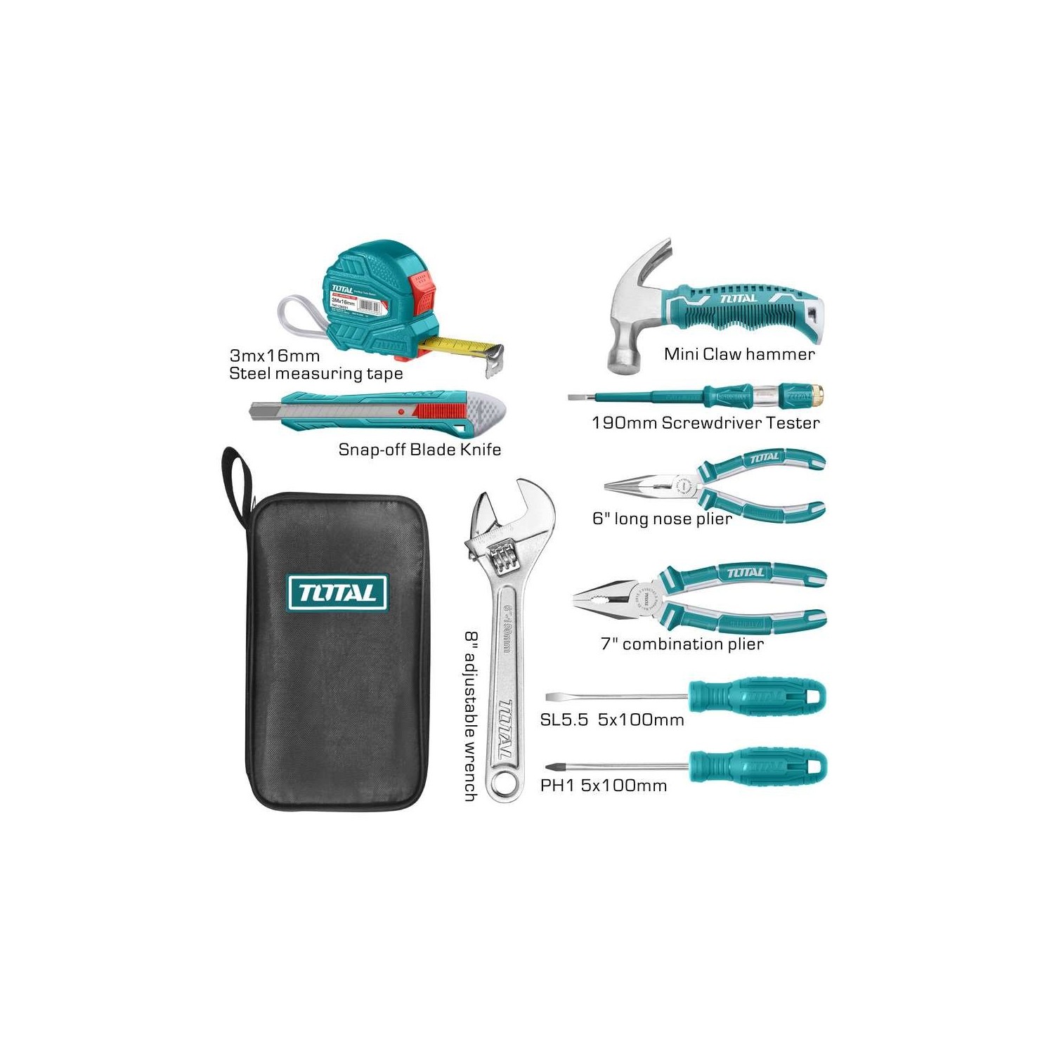 Set da 9 Pezzi Include: 1 flessometro 1 cacciavite a croce PH1 - 5x100mm 1 cacciavite a taglio SL5.5 - 5x100mm 1 chiave regolabile 1 pinza a becchi lunghi 1 pinza combinata 1 taglierino 1 cacciavite cercafase 1 martello